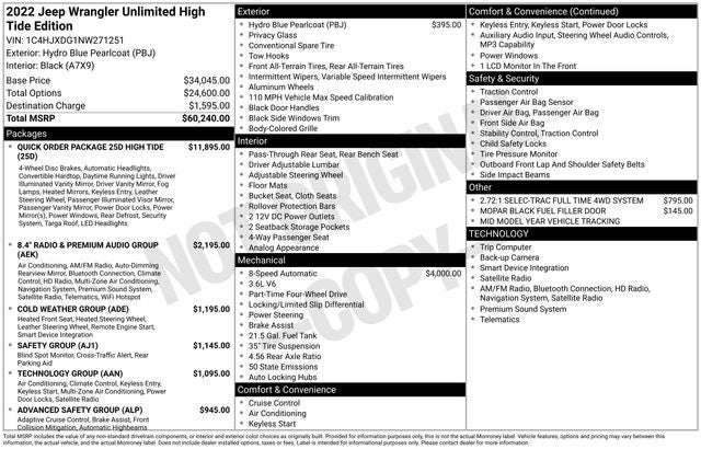 - - - THIS 2022 JEEP WRANGLER UNLIMITED HIGH TIDE IS A ONE OWNER LOCAL TRADE WITH A PERFECT HISTORY REPORT AND THE REMAINDER OF THE 5 YEAR 60,000 MILE FACTORY WARRANTY !!!