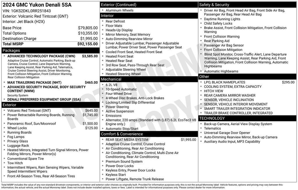 *** ONE OWNER ***, *** CLEAN CARFAX ***, *** APPLE CARPLAY/ANDROID AUTO ***, *** AUTOMATIC CRUISE CONTROL ***, *** BACKUP CAMERA ***, *** HEATED SEATS ***, *** LANE CHANGE ALERT ***, *** SIDE BLIND ZONE ALERT ***, *** NAVIGATION ***, *** REMOTE START ***, *** POWER LIFTGATE ***, *** POWER SLIDING MOONROOF ****, *** PUSH BUTTON START ***, *** AIR CONDITION/VENTILATED SEATS ***, *** LEATHER SEATS ***, *** BOSE PREMIUM SOUND SYSTEM ***, Yukon Denali, 4D Sport Utility, EcoTec3 6.2L V8, 4WD, Volcanic Red Tintcoat, Jet Black Leather, 12-Way Power Seat Adjusters, 15 Diagonal Multi-Color Head-Up Display, 2 Presets For Outside Rearview Mirrors, 3rd Row 60/40 Power-Folding Split-Bench Seat, Adaptive Cruise Control, Advanced Security Package, Advanced Technology Package, Bose 14-Speaker Surround w/CenterPoint, Bright Front & Rear Door Sill Plates, Chrome Door Handles w/Body-Color Strip, Dual Exhaust System, Enhanced Automatic Emergency Braking, Enhanced Automatic Parking Assist, Floor Console, Galvano Bodyside Moldings, Glass Breakage Sensor, Hands-Free Power Programmable Rear Liftgate, HD Surround Vision, Heated 2nd Row Outboard Position Seats, Heated Driver & Front Passenger Seats, Heated Steering Wheel, Hill Descent Control, Inside Rear-View Auto-Dimming Mirror, Inside Rearview Auto-Dimming Rear Camera Mirror, Max Trailering Package, Outside Heated Power-Adjustable Mirrors, Perforated Heated & Ventilated Dr & Frt Pass Seats, Power Release 2nd Row Bucket Seats, Power Tilt & Telescopic Steering Column, Preferred Equipment Group 5SA, Rear Camera Mirror Washer, Rear Pedestrian Alert, Rear Seat Media System, Reverse Automatic Braking, Safety Alert Seat, Super Cruise, Theft-Deterrent Alarm System, Universal Home Remote, Vehicle Inclination Sensor, Vehicle Interior Movement Sensor, Wireless Charging.