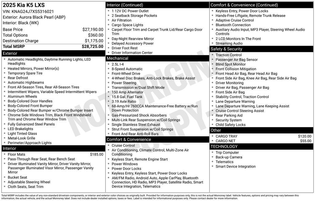 4-Wheel Disc Brakes, 6 Speakers, ABS brakes, Air Conditioning, Alloy wheels, AM/FM radio: SiriusXM, Auto High-beam Headlights, Automatic temperature control, Brake assist, Bumpers: body-color, Cargo Net, Cargo Tray, Carpeted Floor Mats, Cloth Seat Trim, Delay-off headlights, Driver door bin, Driver vanity mirror, Dual front impact airbags, Dual front side impact airbags, Electronic Stability Control, Emergency communication system: Kia Connect (includes 1 year free trial), Four wheel independent suspension, Front anti-roll bar, Front Bucket Seats, Front Center Armrest, Front dual zone A/C, Front reading lights, Fully automatic headlights, Heated door mirrors, Illuminated entry, Knee airbag, Low tire pressure warning, Occupant sensing airbag, Outside temperature display, Overhead airbag, Overhead console, Panic alarm, Passenger door bin, Passenger vanity mirror, Power door mirrors, Power steering, Power windows, Radio data system, Radio: AM/FM Audio System, Rear anti-roll bar, Rear seat center armrest, Rear side impact airbag, Rear window defroster, Remote keyless entry, Security system, Speed control, Speed-sensing steering, Split folding rear seat, Steering wheel mounted audio controls, Tachometer, Telescoping steering wheel, Tilt steering wheel, Traction control, Trip computer, Variably intermittent wipers, and Wheels: 16 x 6.5J Gloss Black Alloy.
